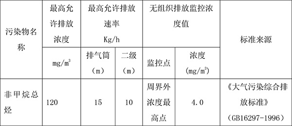 项目排放执行《大气污染综合排放标准》(GB16297-1996)表 2 中的 二级标准要求,无组织排放执行《大气污染综合排放标准》(GB16297-1996) 表 2 中的无组织排放监控浓度值。具体详见下表: