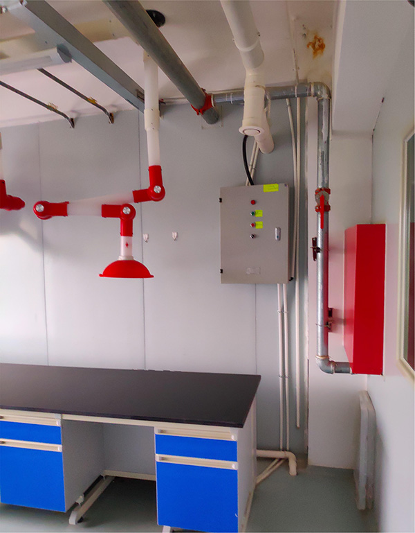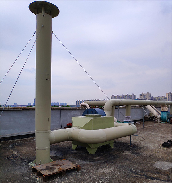 本项目废气污染源主要为化验室的有机废气,废气主要成份为低级 烃类,不含苯、甲苯等有害气体。项目的废气已经配套集气罩、集气风管、 离心风机等,并已安装在大楼的三楼顶层天台上,实际使用 15 套排风系统, 其中 9 套室外自带风机抽风,六套室外未安装抽风风机。经计算,总计风 量在 20000m3/h 以内,设计时考虑到阻力因素等,因此,设计成 20000m3/h 的废气处理装置的排风量。原先已建设备中无废气吸收处理装置,现需增 加壹套废气处理装置、总汇排风风机壹台及 PPR 的引风管、排风管、风阀、 管件及五金等。改造后,废气吸收装置将安装在大搂的第四层天台上,净 化达标后的空气加压至 15 米高空排放。