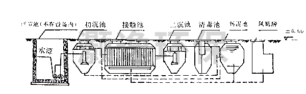 WSZI设备的设计主要是对生活污水和与之相类似的工业有机污水的处理,其主要处理手段是采用目前较为成熟的生化处理技术接角氧化法,水质设计参数也按一般生活污水水质设计计算,按进水平均为BOD5 200mg/l计,出水BOD5按20mg/l计,共有六部分组成:(1)初沉池(2)接触氧化池(3)二沉池(4)消毒池、消毒装置(5)污泥池(6)风机房、风机组成。现分别论述如下: